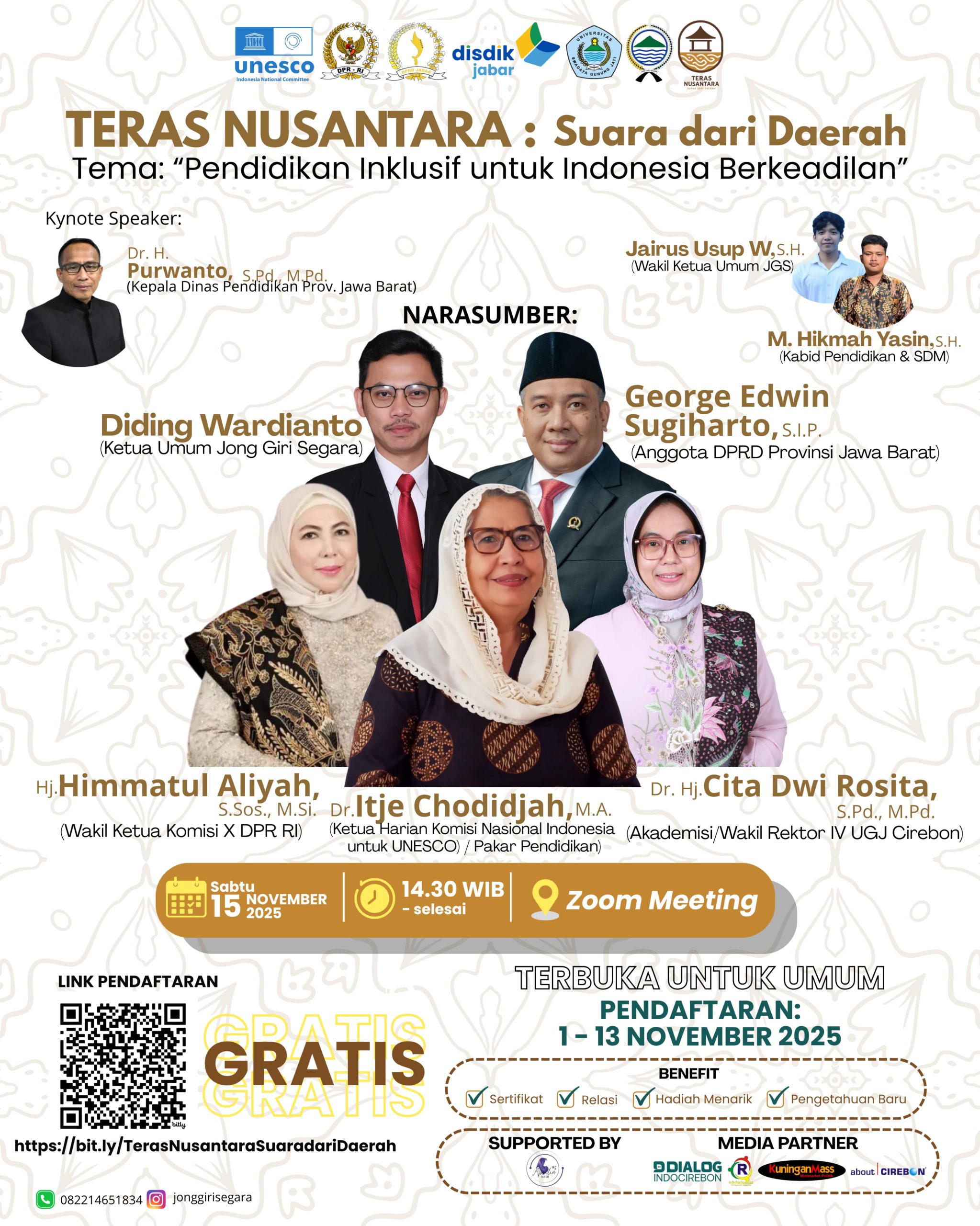 Kegiatan yang dilaksanakan pada Sabtu, 15 November 2025, menghadirkan berbagai narasumber diantaranya Dr. Itje Chididjah, MA (Ketua Harian Komisi Nasional Indonesia untuk UNESCO), Dr, Hj. Cita Dwi Rosita, M.Pd. (Akademisi/Wakil Rektor IV UGJ Cirebon) George Edwin Sugiharto, S.IP (Anggota DPRD Provinsi Jawa Barat), Diding Wardianto, S.Sos (Ketua Umum Jong Giri Segara) Seminar ini bertujuan memperkuat pemahaman tentang praktik pendidikan inklusif, memetakan tantangan di daerah, serta merumuskan rekomendasi kebijakan untuk mendorong pemerataan akses pendidikan di seluruh Indonesia.